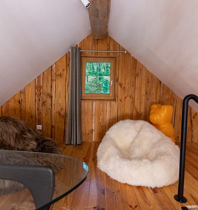 A l'intérieur vous découvrirez la douceur de l'alliance du bois rond et des matériaux bruts comme le fer, le verre ..... le tout niché dans le cadre naturel d'une forêt en Périgord.