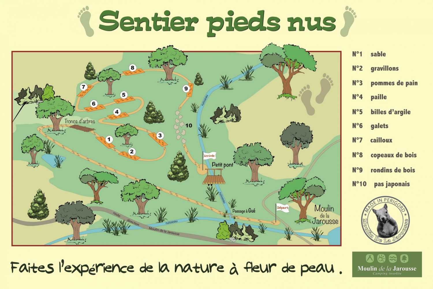 This 630-metre ‘Nature & Liberty’ trail offers a change of pace as you stroll barefoot over pine cones, bark, shavings, sawdust, sand, pebbles, sand... a river that will tickle your feet and perhaps offer some new sensations. With friends or family, young and old alike can have fun testing their skills on this trail with its balancing zones...