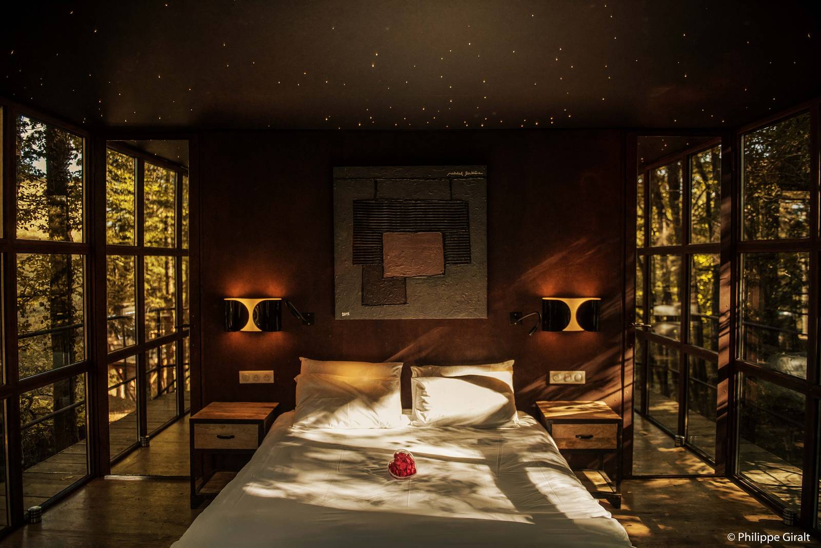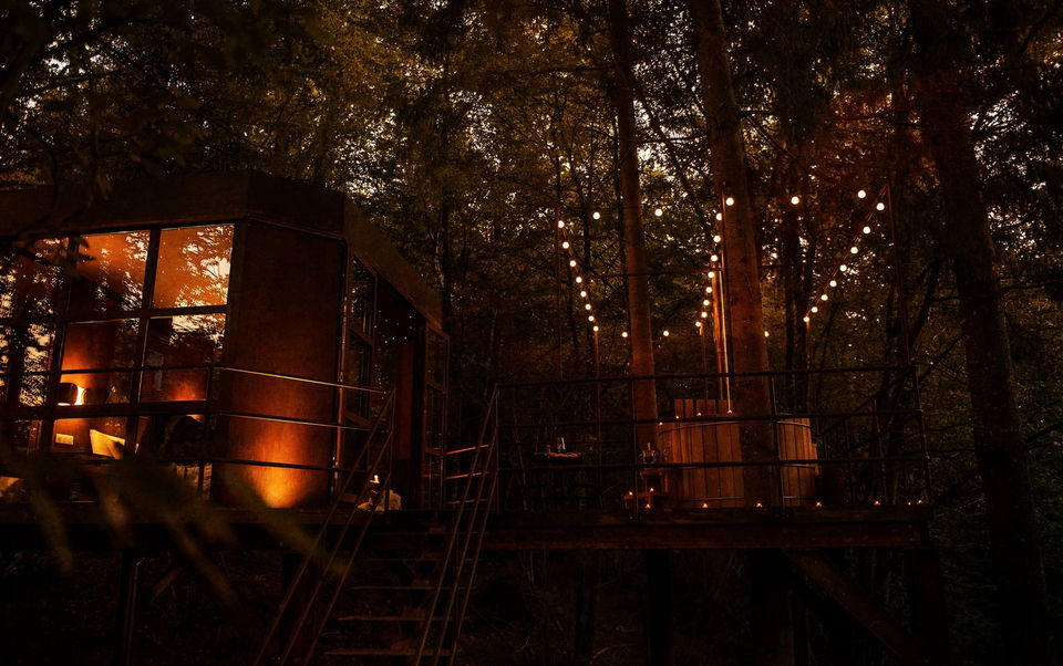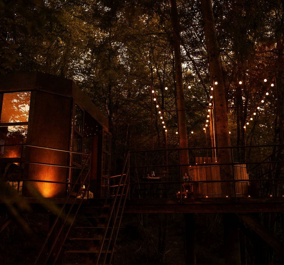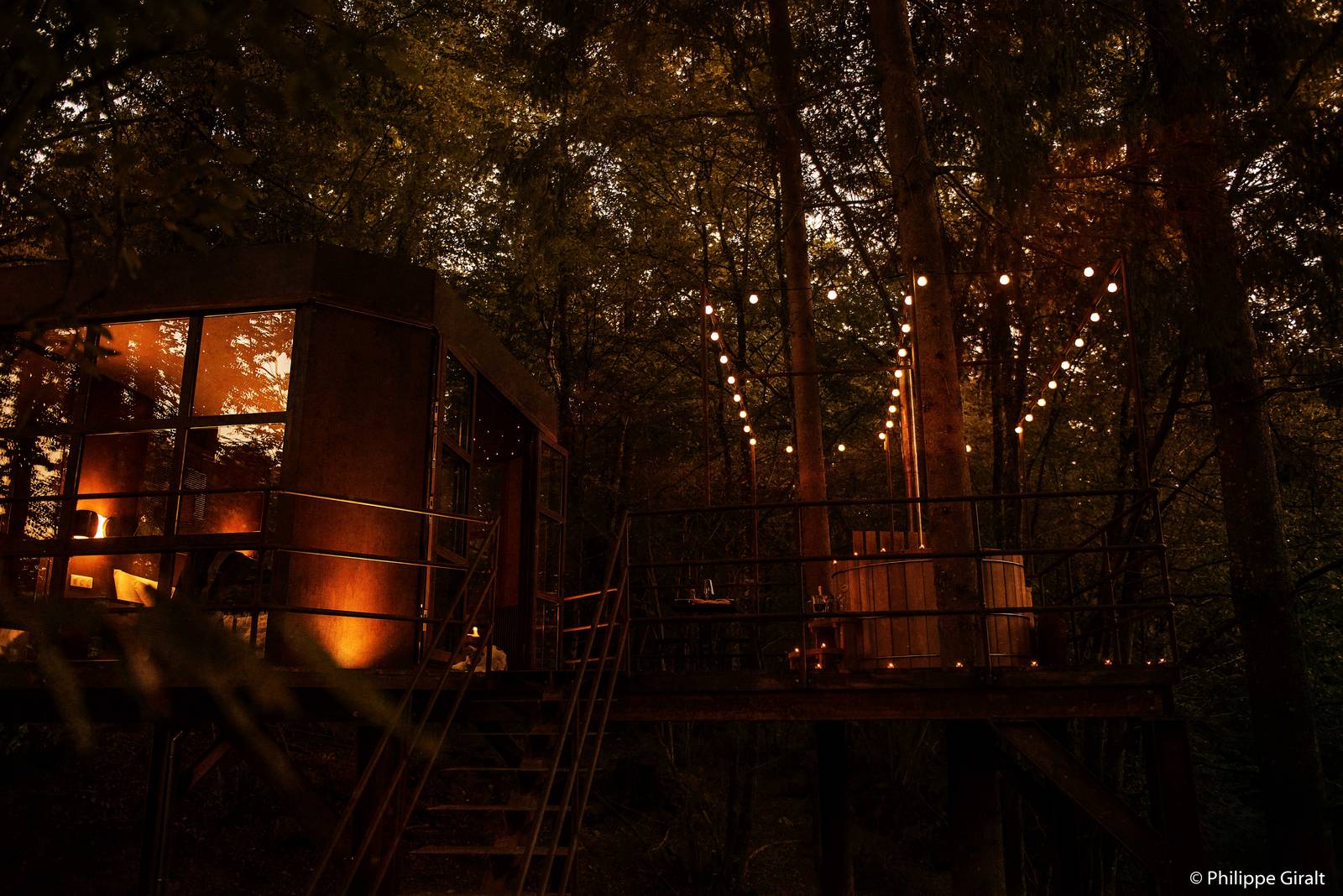 The Cabane Métal is a luxurious cabin for a romantic getaway. Made of Corten metal and entirely glazed, this cubic cabin is resolutely modern. It features a queen-size bed with a starry sky, a Stark table and chairs, a shower room with WC and a nook with mini bar and Nespresso machine. An illuminated terrace faces the bed, and there, nestled in the comfort of the forest, you'll enjoy your PRIVATE Nordic Spa, deliciously heated to 38°.