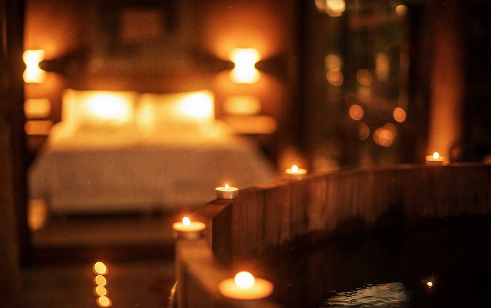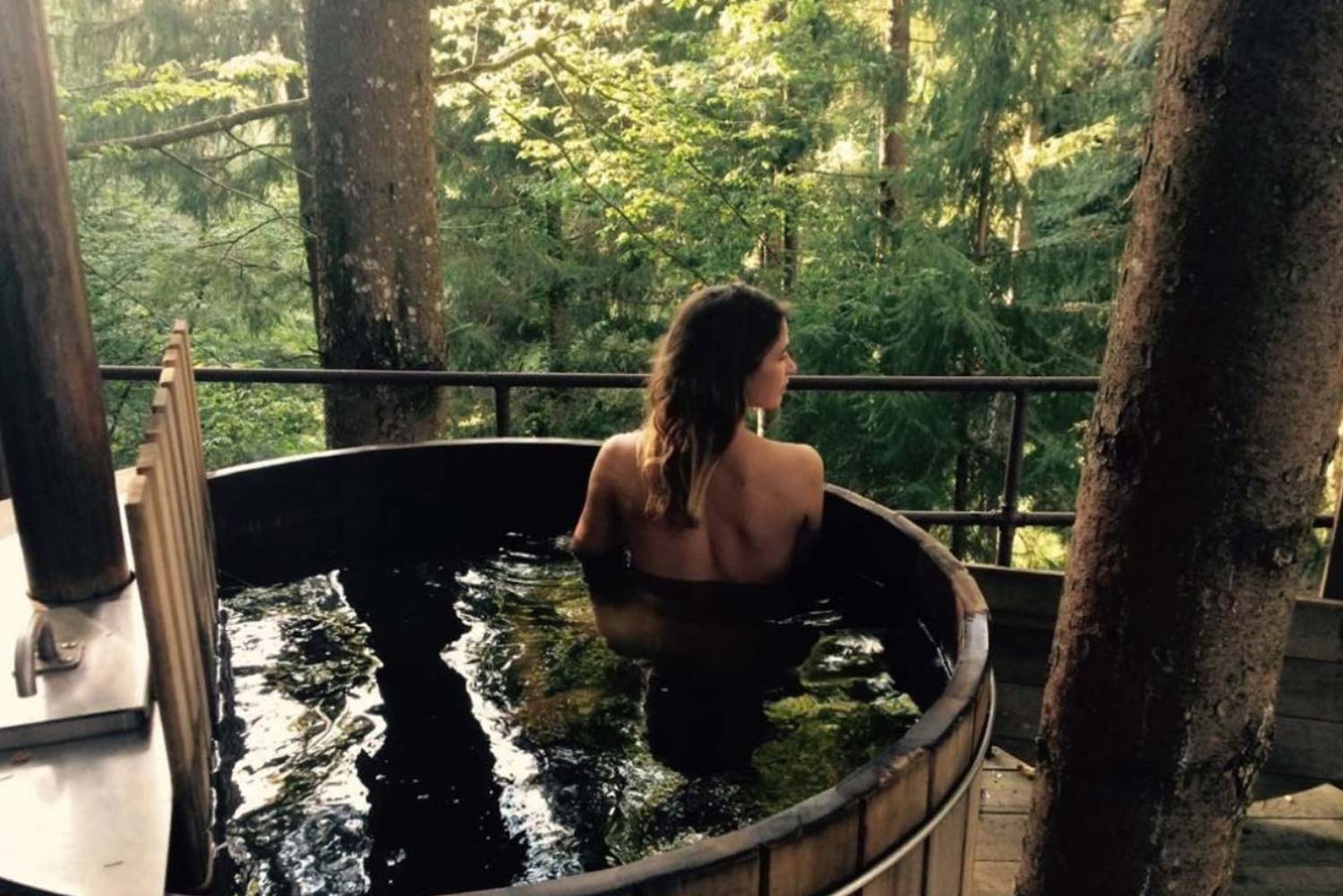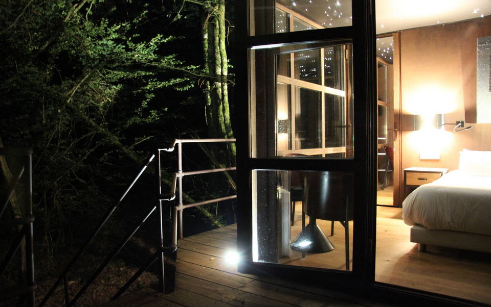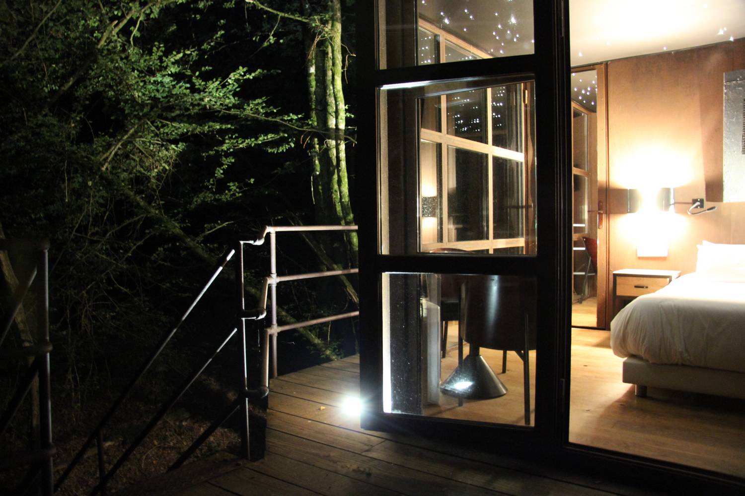The Cabane Métal is a luxurious cabin for a romantic getaway. Made of Corten metal and entirely glazed, this cubic cabin is resolutely modern. It features a queen-size bed with a starry sky, a Stark table and chairs, a shower room with WC and a nook with mini bar and Nespresso machine. An illuminated terrace faces the bed, and there, nestled in the comfort of the forest, you'll enjoy your PRIVATE Nordic Spa, deliciously heated to 38°.