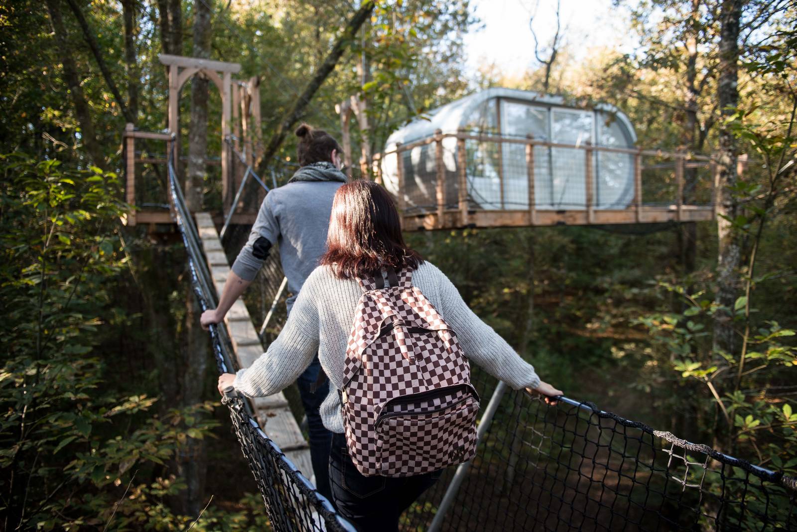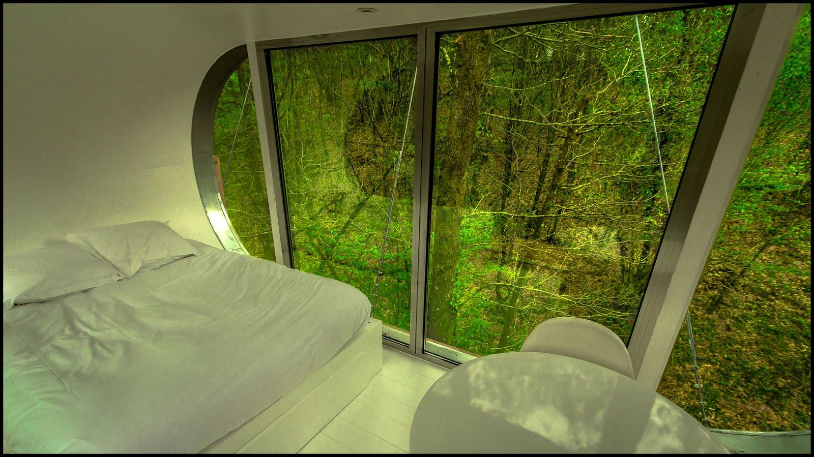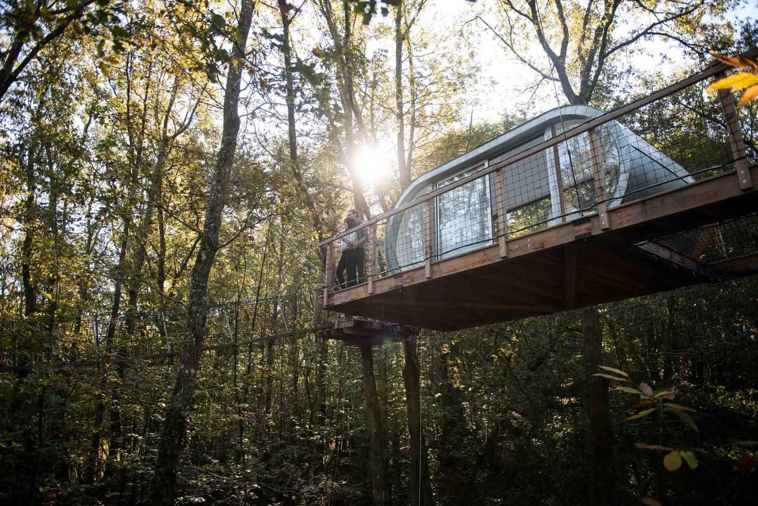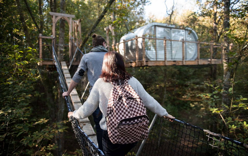 Le Module is the highest of our cabins! Guyed to several trees, it seems to hang over the treetops! Perched at over 12 m and accessible via several secure monkey bridges, it promises a night as close to nature as possible. A double bed (140cm), a table and chairs make up this unique cabin. Its large glass walls, immaculate interior and suspended terrace will give you the intimate feeling of being ONE with its unspoilt environment. A transparent design for a magical immersion in the heart of a forest that you can experience, dream about and enjoy in complete freedom. Access requires physical effort and a certain amount of skill.