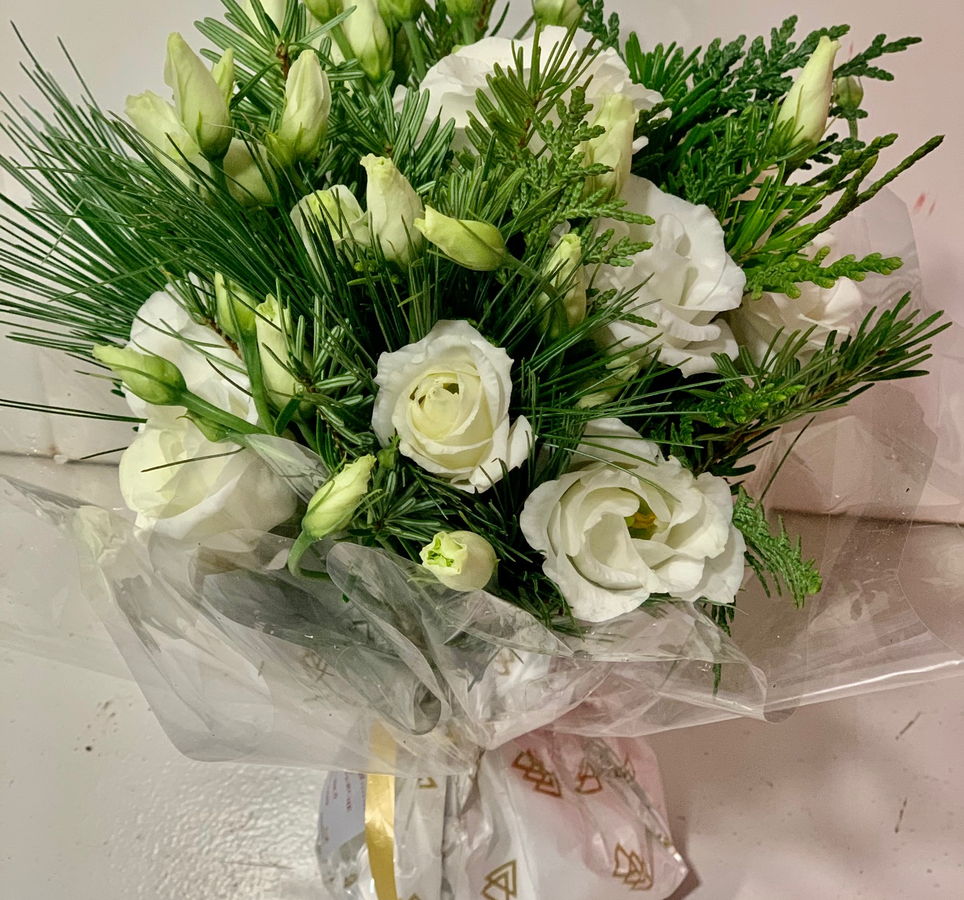 A beautiful bouquet of white flowers waiting for you in your tree house, easy to take home with you thanks to its water pouch.