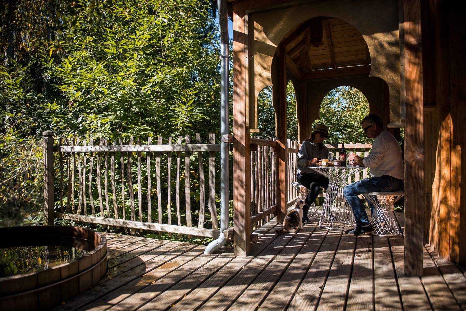 The Bollywood cabin, perched at 6m and accessed by a monkey bridge, is a luxury cabin that can sleep up to 4 people. It has an open-plan living area with a queen-size bed, 2 bunk beds, a lounge area, a walk-in shower room and separate wc. Its architecture and luminous decor are reminiscent of the palaces of India, where it's good to recharge your batteries and breathe in the heady scent of incense. A large terrace sheltered by trees houses a private Nordic Spa where you can extend your moment of relaxation in water heated to 38°.
