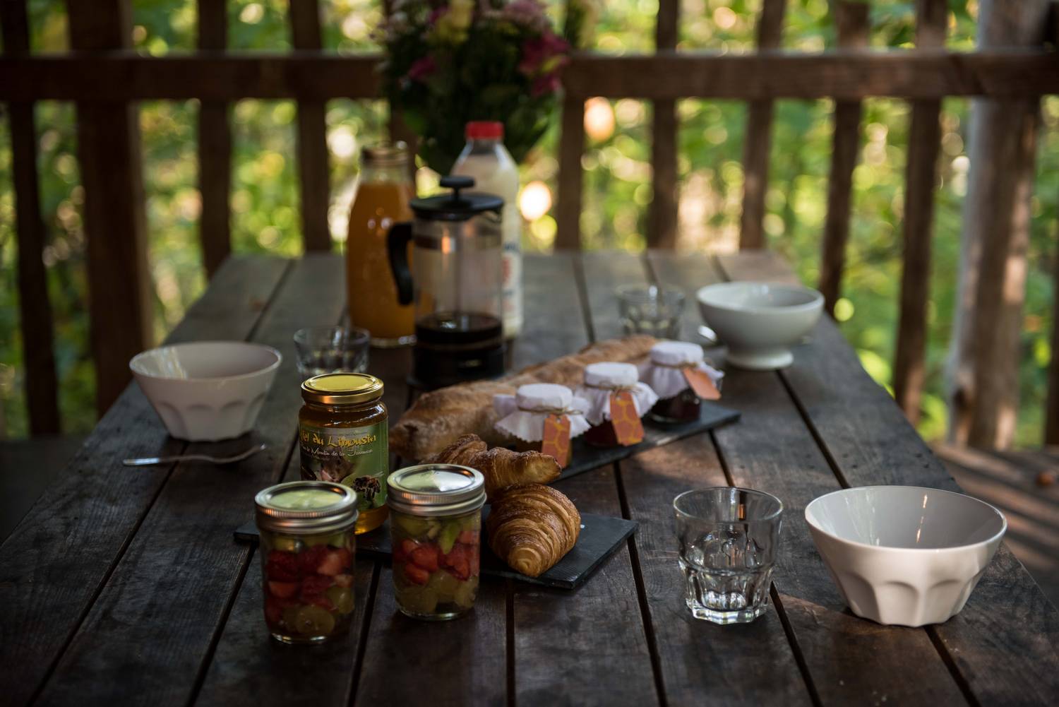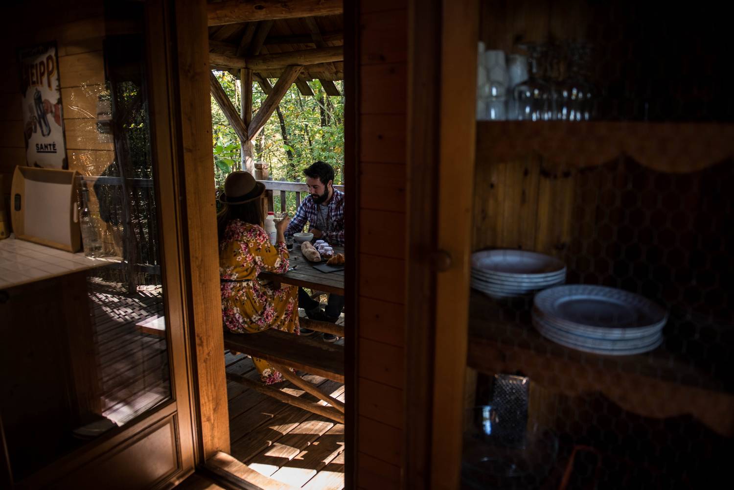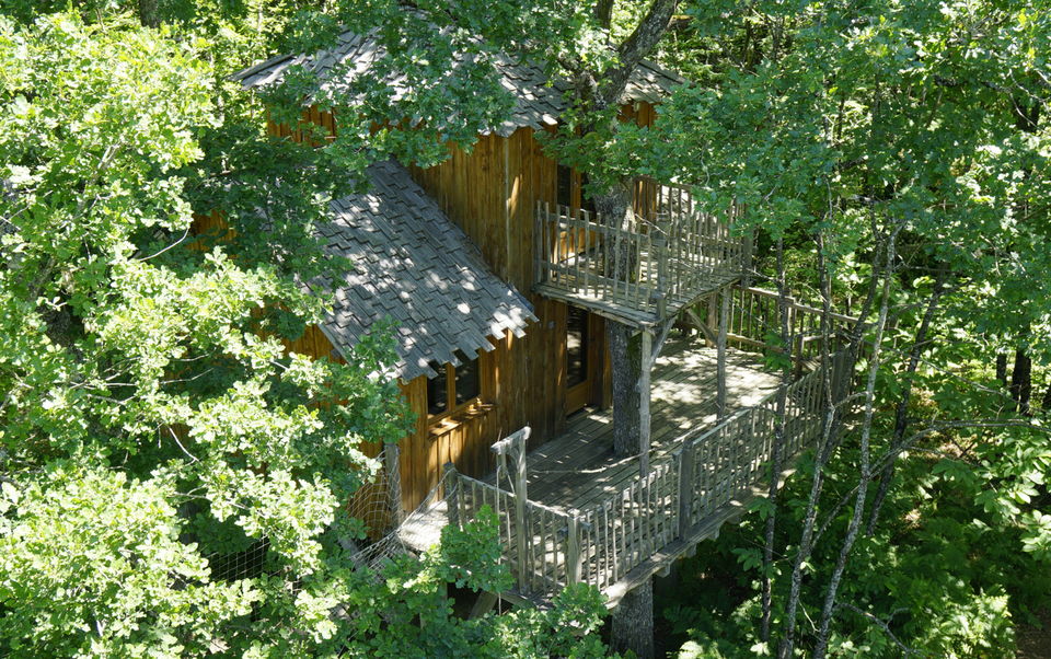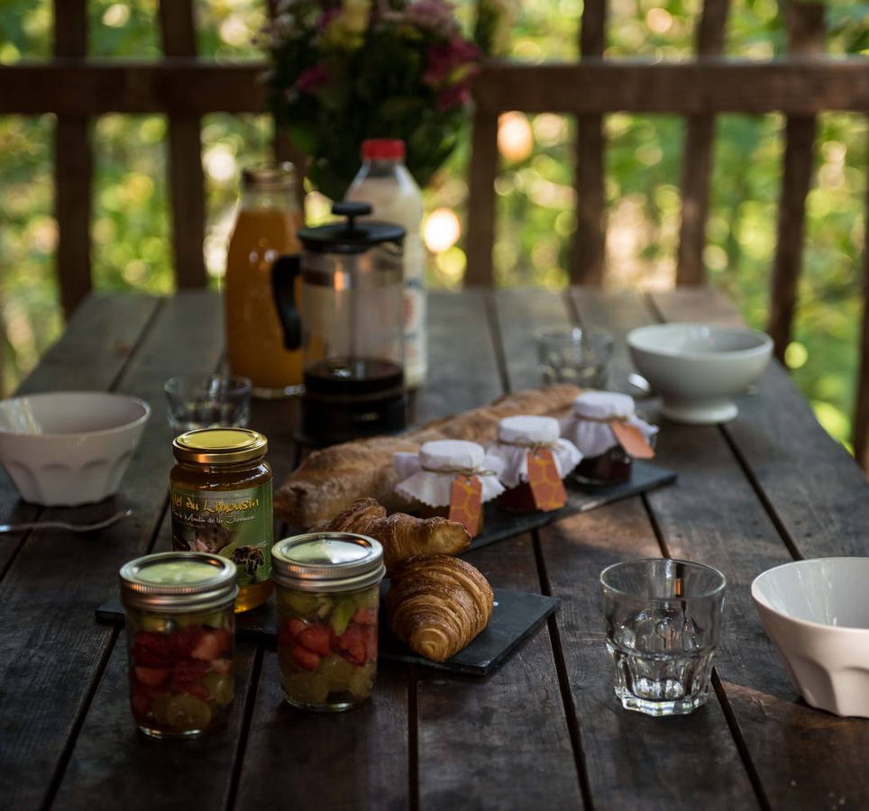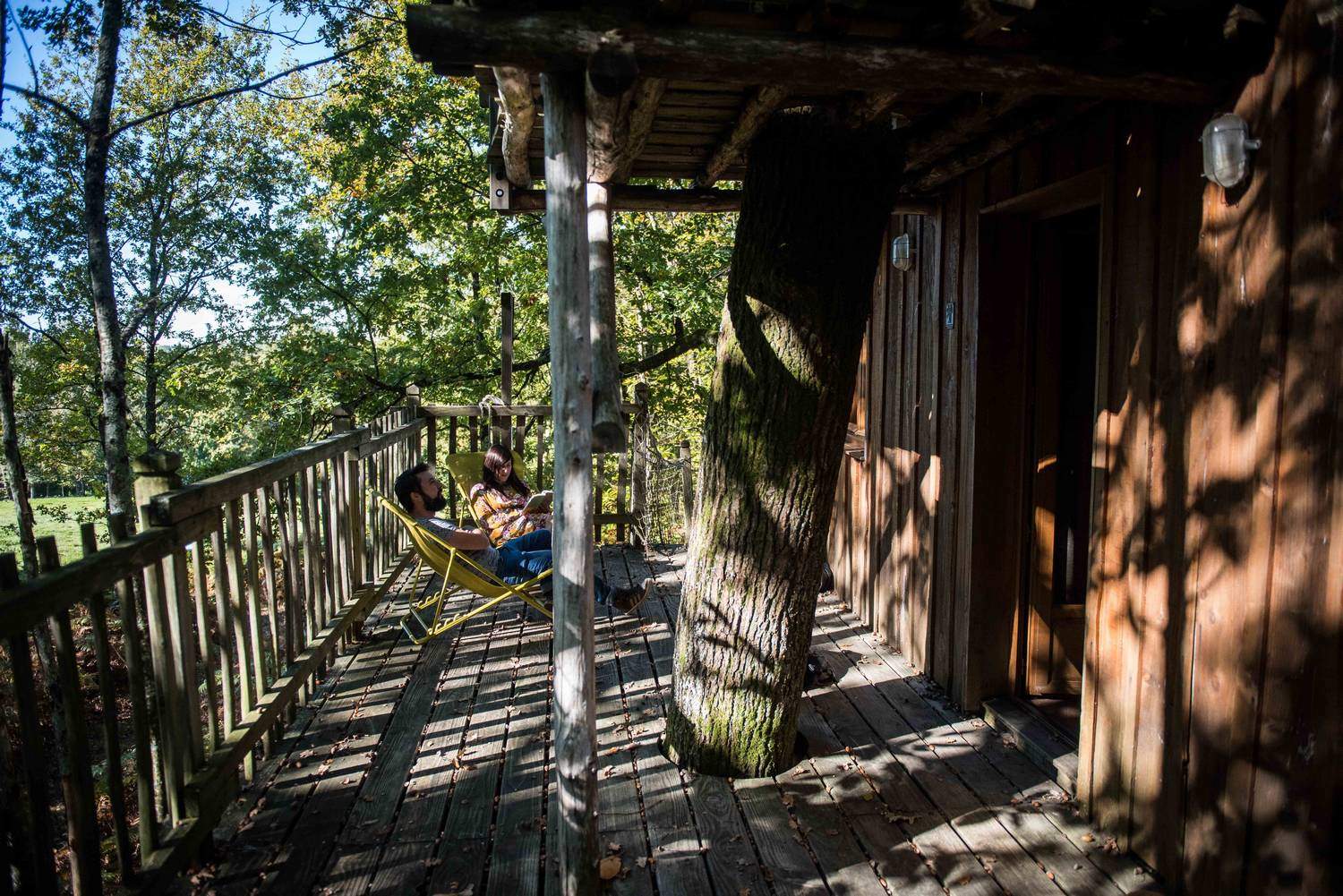 The cabane aux terrasses comprises a living room and 2 sleeping areas. The first, on the first floor, has a double bed (140cm) and its own private terrace. The second, tucked away on the mezzanine like a cabin within a cabin, has 2 80cm beds. The living room, surrounded by its terrace, has a small kitchen with fridge and gas hob and a pull-out sofa bed. The cabane aux terrasses has a dry toilet. A large terrace surrounds this space and includes a covered area with a large dining table. This woodland cabin faces due south, with views over rolling meadows where cows graze. An oak tree runs across the terraces.