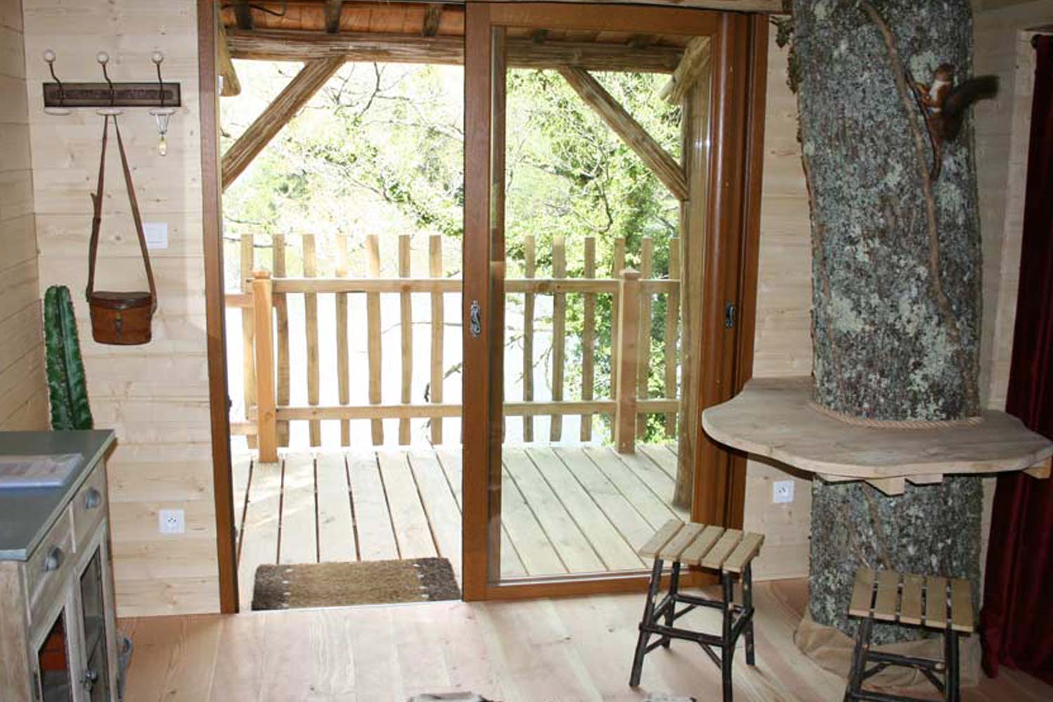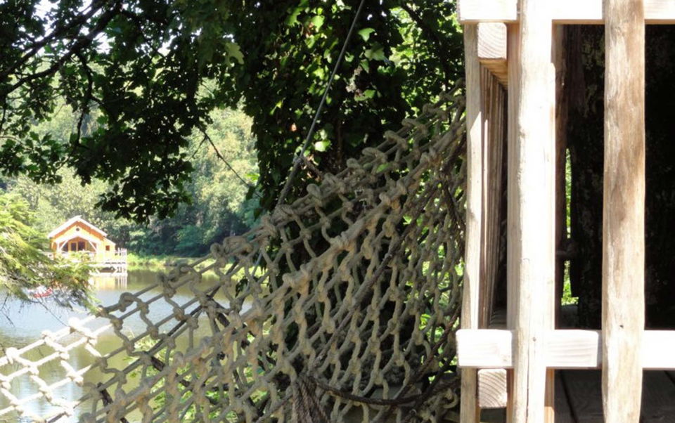 Aux Trois Chênes is an 18m2 family cabin that can accommodate up to 5 people. Accessed via a small monkey bridge, it comprises a living area with an oak tree running through it, a lounge, a small kitchen and an alcove with 3 single beds. Upstairs, the master bedroom has a double bed (140cm). A large terrace with table and stools offers uninterrupted views over the lake.