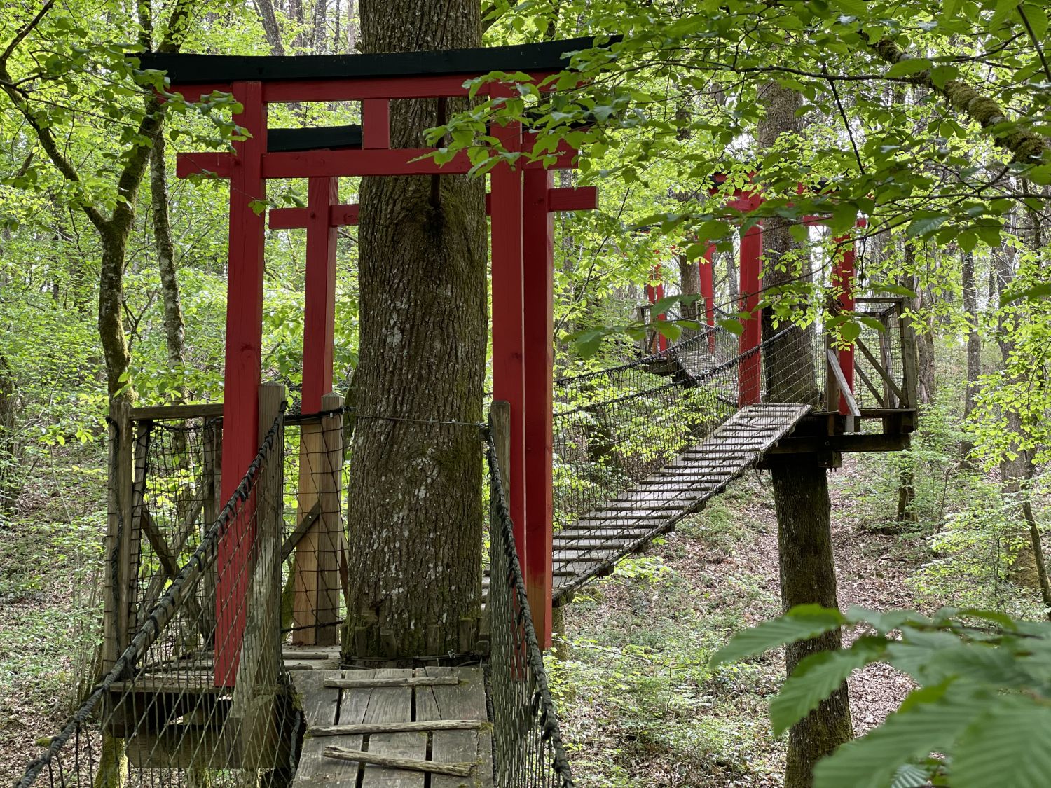 The Zen cabin is a 20 m2 family cabin that can accommodate up to 5 people. Accessed via a 42-metre-long monkey bridge, this red cabin with its roof typical of Japanese pagodas is the promise of an exotic night in the heart of the forest. Entirely glazed, it offers an open-plan living area with a double bed (140cm), 3 single beds (80cm) nestling in an alcove, a small kitchen area and a dry toilet. Its uncluttered decor is an invitation to travel, inspired by the codes of Japanese homes.