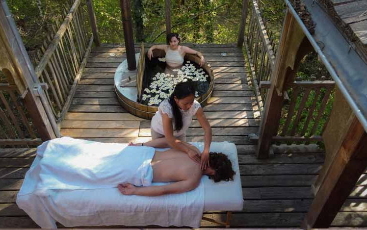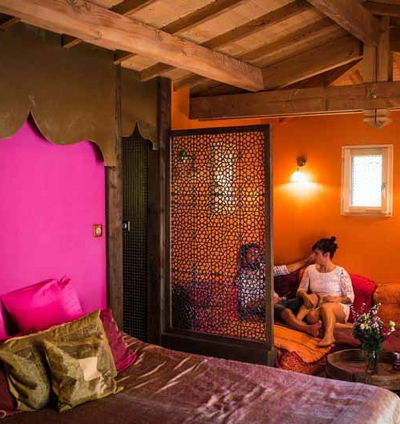 La cabane Bollywood, perchée à 6m et accessible par un pont de singe, est une cabane de luxe pouvant accueillir jusqu'à 4 personnes. Elle dispose d'un espace de vie ouvert avec un lit queen size, 2 lits superposés, d'un coin salon, d'une salle de douche à l'italienne, de wc séparés. Son architecture et sa décoration lumineuse rappelle les palais des indes ou il fait bon se ressourcer en humant le parfum envoutant des encens. Une grande terrasse isolée par les arbres abrite un Spa Nordique privatif ou vous pourrez prolonger ce moment de détente dans une eau chauffée à 38°.