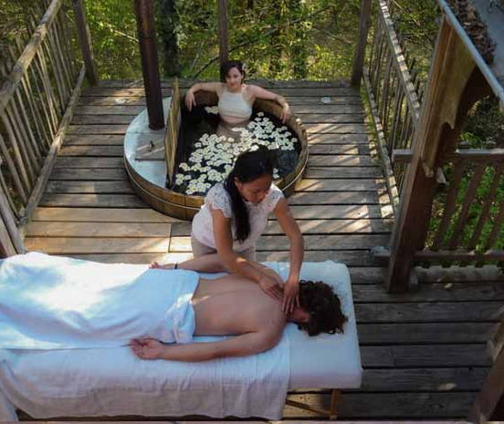 Prolongez l'expérience indienne dans votre spa privatif niché parmi les arbres, avec vue plongée sur la canopée. Accès libre à la piscine chauffée du Moulin.