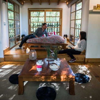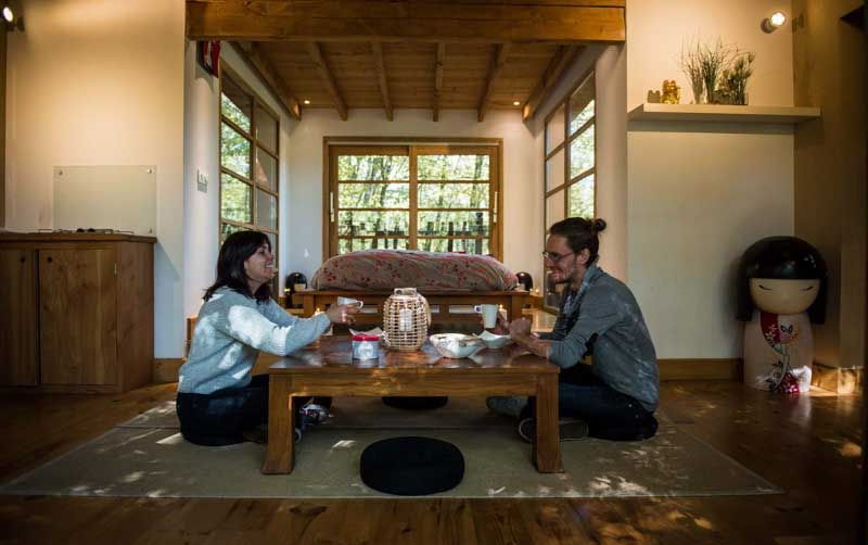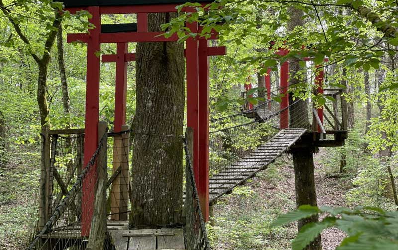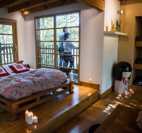 La cabane Zen est une cabane familiale de 20 m2 pouvant accueillir jusqu'à 5 personnes. Accessible par un pont de singe de 42 mètres de long, cette cabane rouge à la toiture typique des pagodes japonaises, est la promesse d'une nuit dépaysante au cœur de la forêt. Entièrement vitrée, elle offre une pièce de vie ouverte avec un grand lit en 140, 3 lits en 80 nichés dans une alcôve, un petit espace cuisine et des toilettes sèches. Sa décoration épurée invite au voyage en reprenant les codes des habitations nippones.