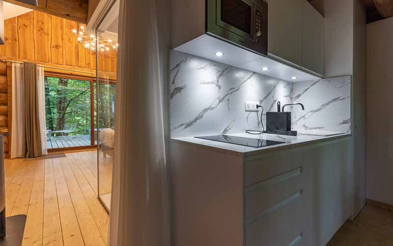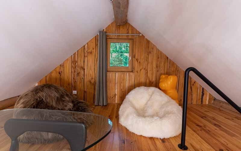 A l'intérieur vous découvrirez la douceur de l'alliance du bois rond et des matériaux bruts comme le fer, le verre ..... le tout niché dans le cadre naturel d'une forêt en Périgord.