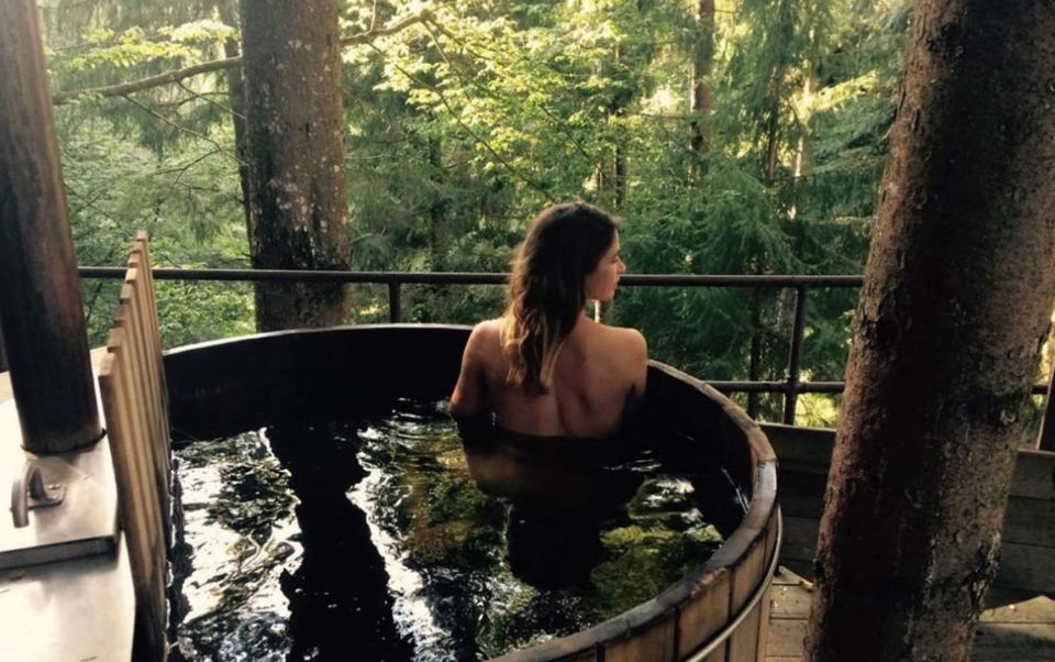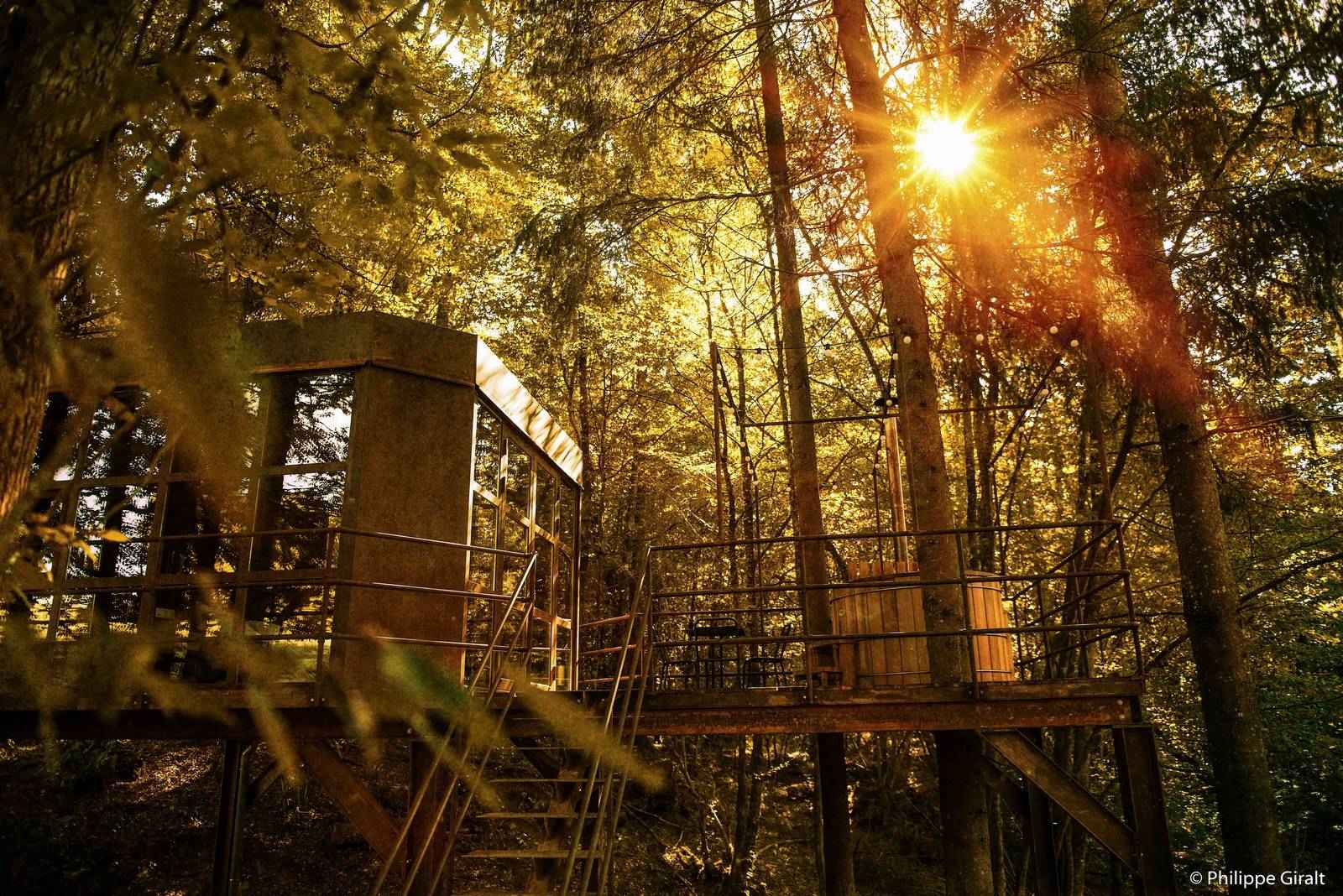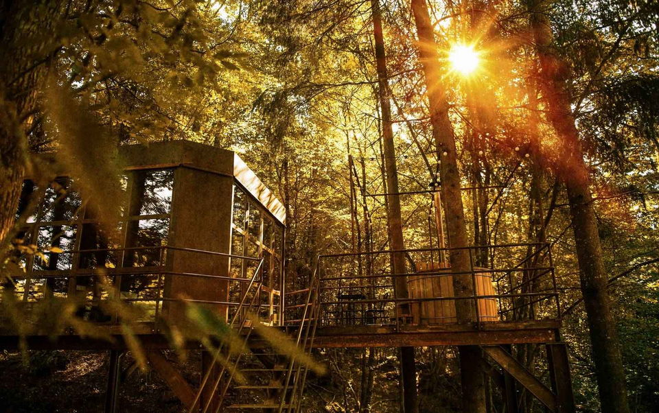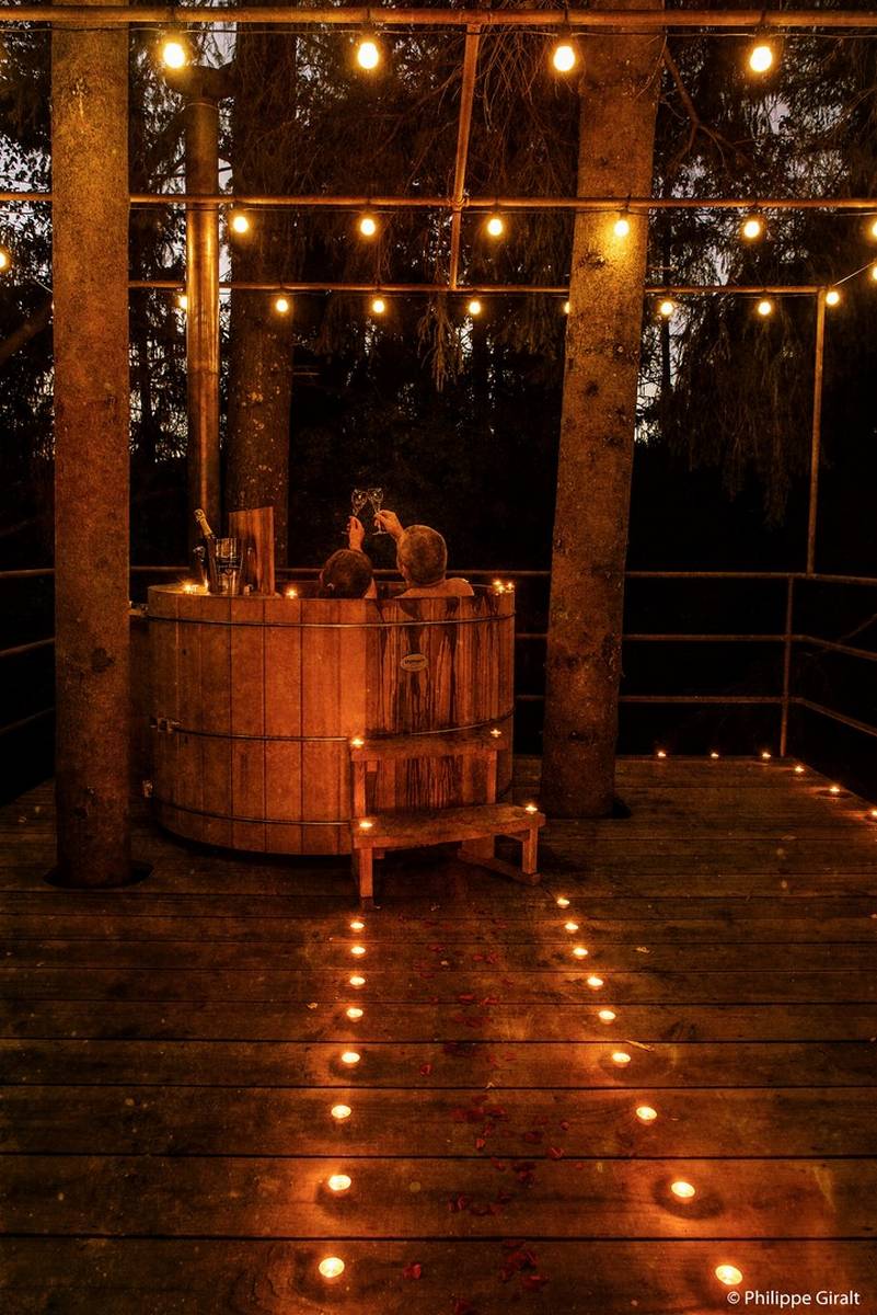 The Cabane Métal is a luxurious cabin for a romantic getaway. Made of Corten metal and entirely glazed, this cubic cabin is resolutely modern. It features a queen-size bed with a starry sky, a Stark table and chairs, a shower room with WC and a nook with mini bar and Nespresso machine. An illuminated terrace faces the bed, and there, nestled in the comfort of the forest, you'll enjoy your PRIVATE Nordic Spa, deliciously heated to 38°.