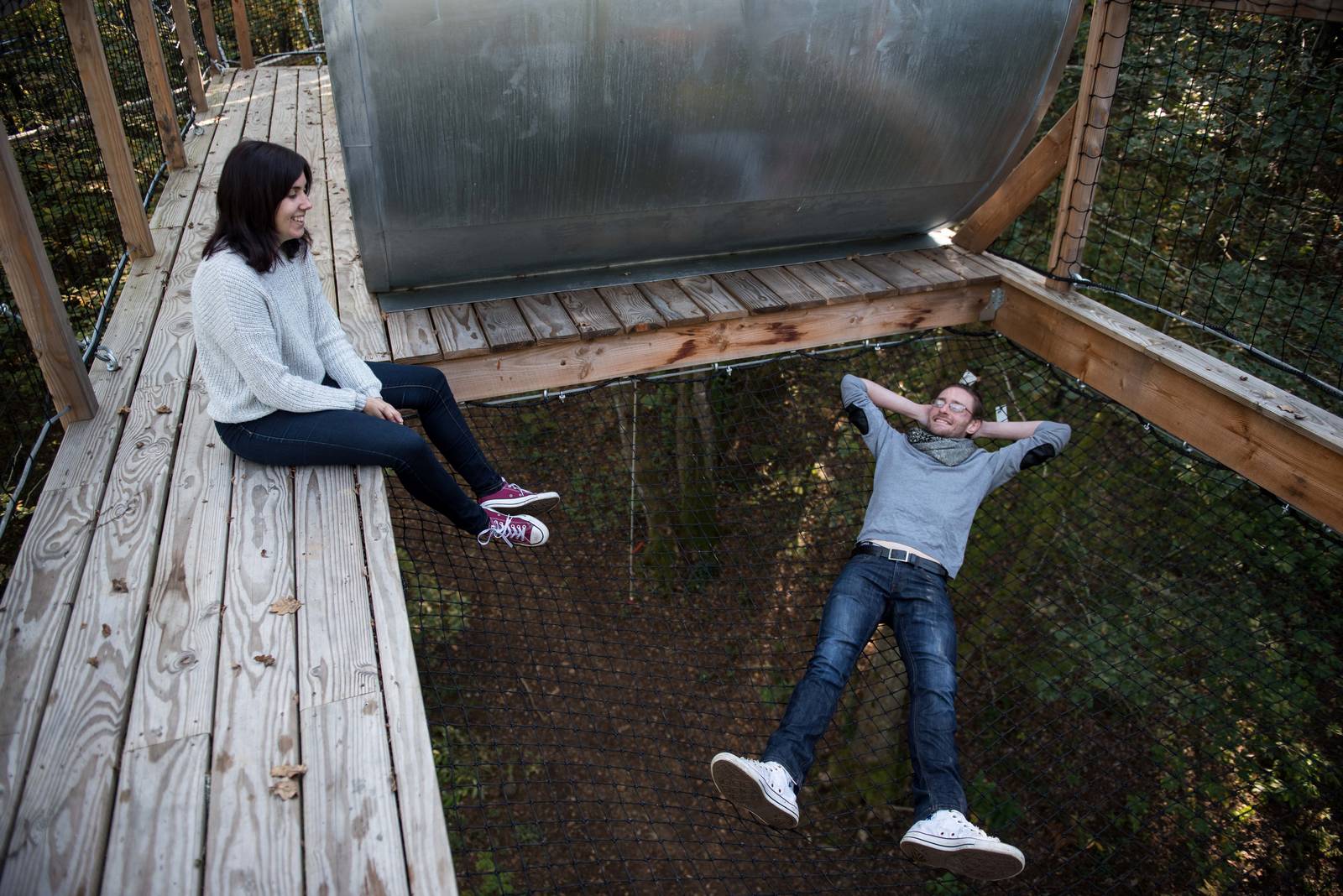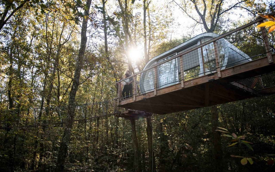 Le Module is the highest of our cabins! Guyed to several trees, it seems to hang over the treetops! Perched at over 12 m and accessible via several secure monkey bridges, it promises a night as close to nature as possible. A double bed (140cm), a table and chairs make up this unique cabin. Its large glass walls, immaculate interior and suspended terrace will give you the intimate feeling of being ONE with its unspoilt environment. A transparent design for a magical immersion in the heart of a forest that you can experience, dream about and enjoy in complete freedom. Access requires physical effort and a certain amount of skill.