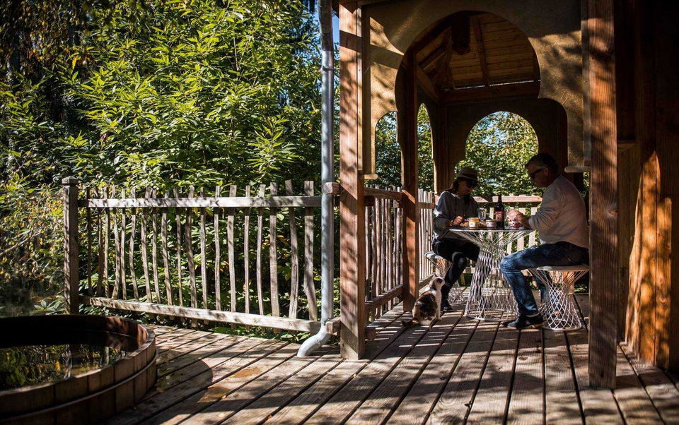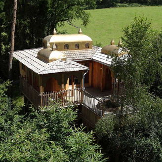 The Bollywood cabin, perched at 6m and accessed by a monkey bridge, is a luxury cabin that can sleep up to 4 people. It has an open-plan living area with a queen-size bed, 2 bunk beds, a lounge area, a walk-in shower room and separate wc. Its architecture and luminous decor are reminiscent of the palaces of India, where it's good to recharge your batteries and breathe in the heady scent of incense. A large terrace sheltered by trees houses a private Nordic Spa where you can extend your moment of relaxation in water heated to 38°.