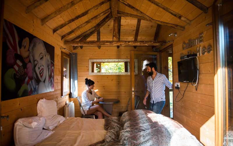 The Moulin cabin is accessible via a secure ladder. This cosy nest has a double bed (140cm) and a table and chairs for sharing a meal. A large 17 m2 terrace runs alongside the cabin, offering a breathtaking view over the pond, and also has a table and chairs for outdoor meals.