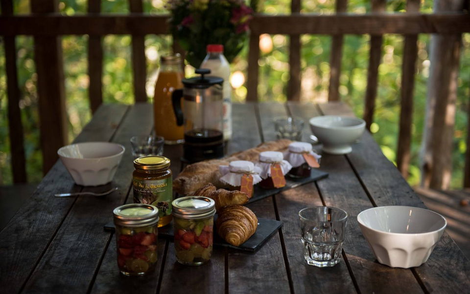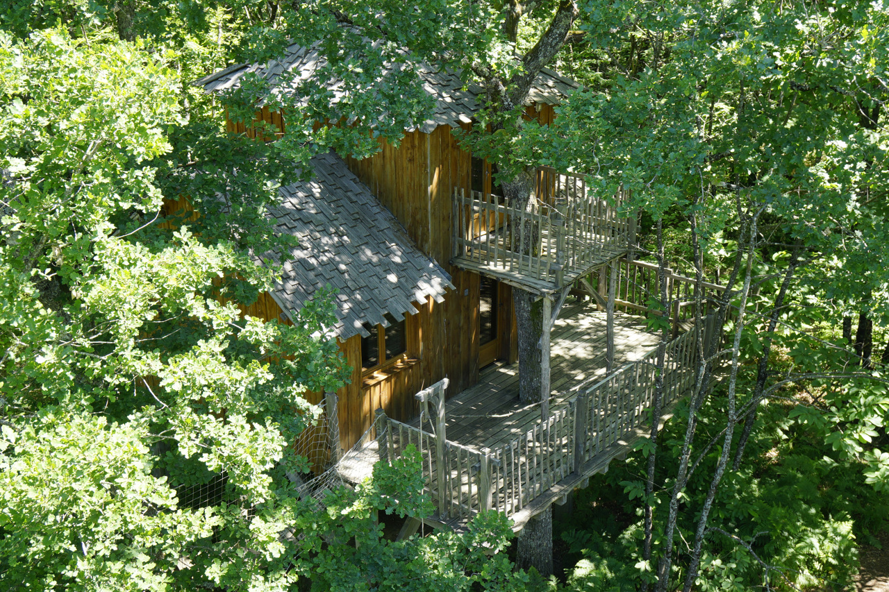 The cabane aux terrasses comprises a living room and 2 sleeping areas. The first, on the first floor, has a double bed (140cm) and its own private terrace. The second, tucked away on the mezzanine like a cabin within a cabin, has 2 80cm beds. The living room, surrounded by its terrace, has a small kitchen with fridge and gas hob and a pull-out sofa bed. The cabane aux terrasses has a dry toilet. A large terrace surrounds this space and includes a covered area with a large dining table. This woodland cabin faces due south, with views over rolling meadows where cows graze. An oak tree runs across the terraces.