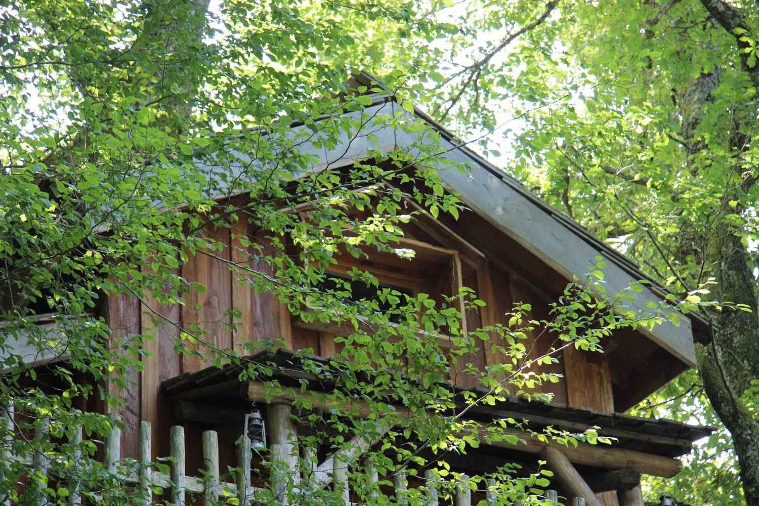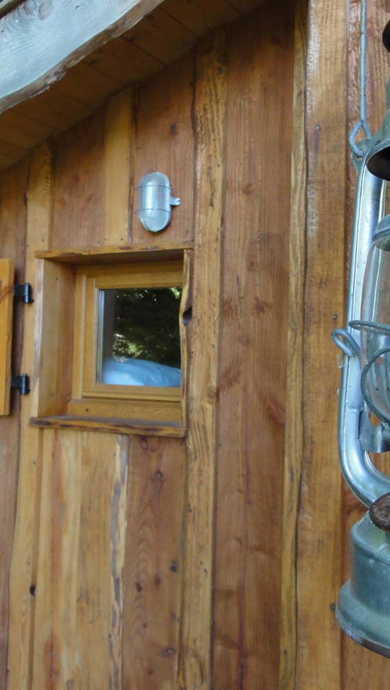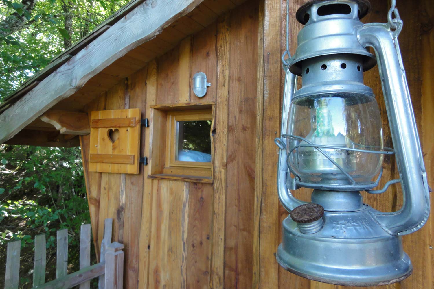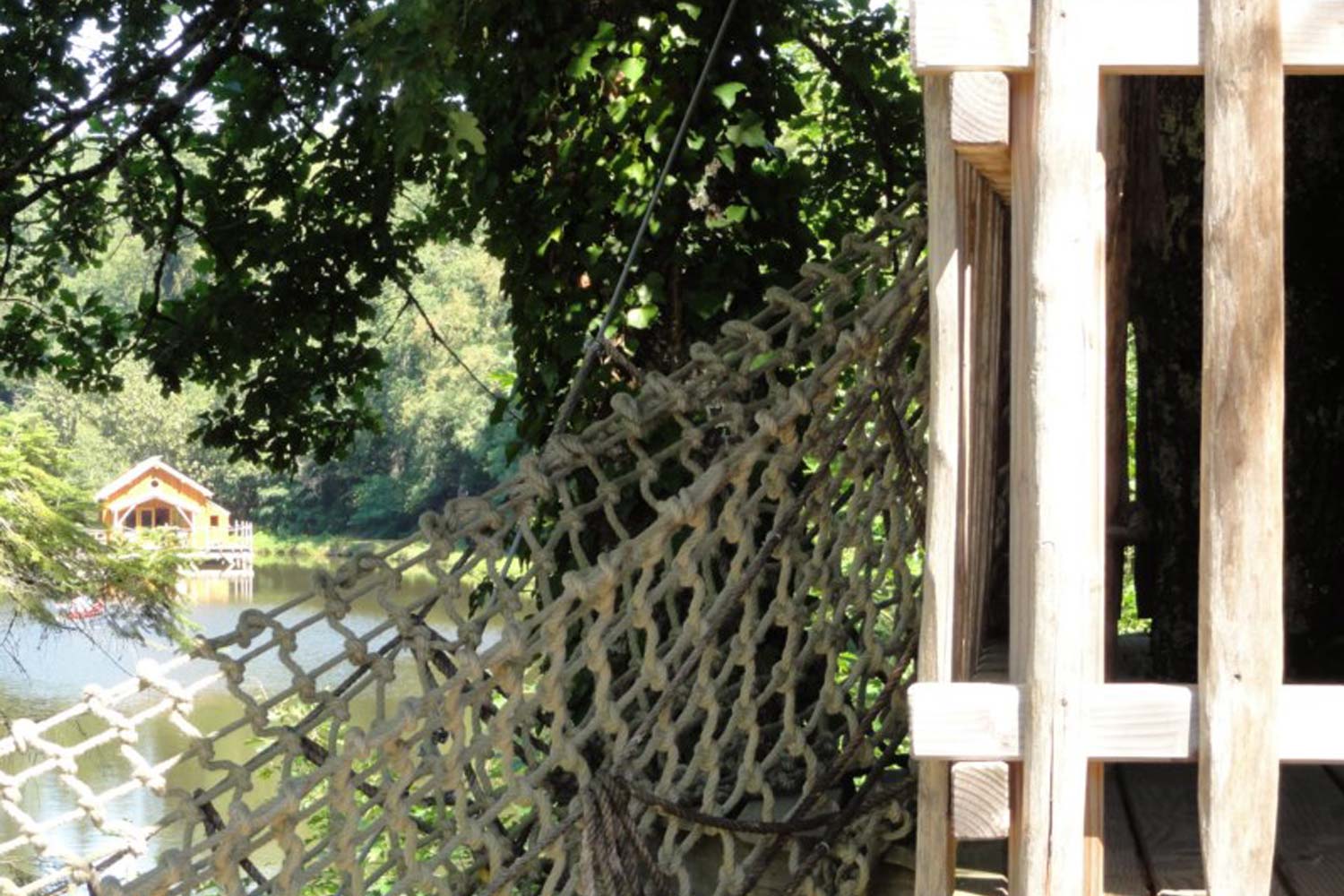 Aux Trois Chênes is an 18m2 family cabin that can accommodate up to 5 people. Accessed via a small monkey bridge, it comprises a living area with an oak tree running through it, a lounge, a small kitchen and an alcove with 3 single beds. Upstairs, the master bedroom has a double bed (140cm). A large terrace with table and stools offers uninterrupted views over the lake.