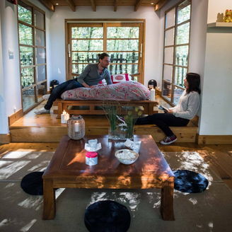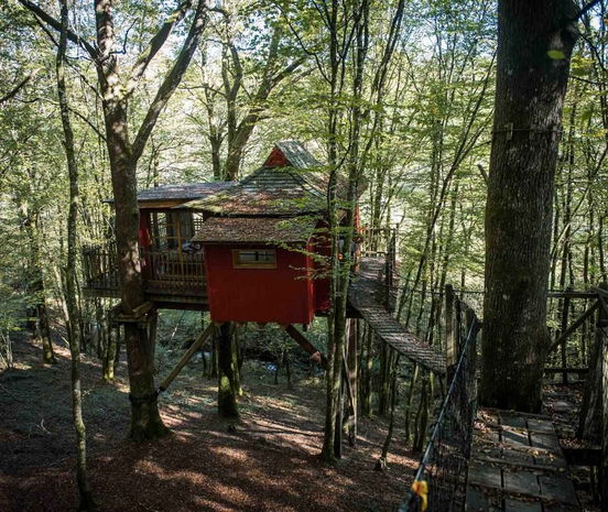 The Zen cabin is a 20 m2 family cabin that can accommodate up to 5 people. Accessed via a 42-metre-long monkey bridge, this red cabin with its roof typical of Japanese pagodas is the promise of an exotic night in the heart of the forest. Entirely glazed, it offers an open-plan living area with a double bed (140cm), 3 single beds (80cm) nestling in an alcove, a small kitchen area and a dry toilet. Its uncluttered decor is an invitation to travel, inspired by the codes of Japanese homes.